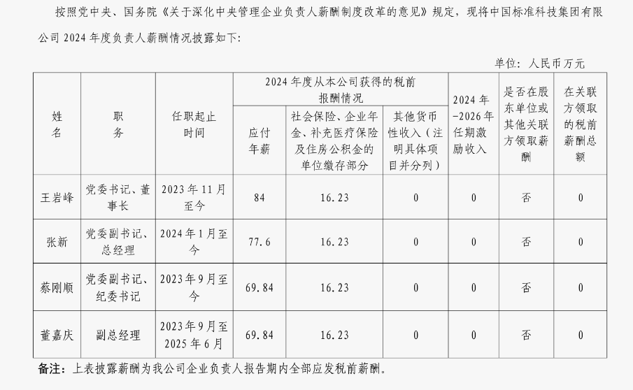 中國(guó)標(biāo)準(zhǔn)科技集團(tuán)有限公司企業(yè)負(fù)責(zé)人2024年度薪酬情況