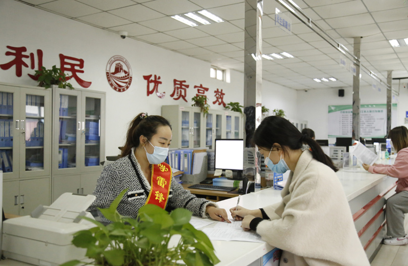 河北省邢臺市襄都區(qū)宴家屯鎮(zhèn)綜合服務(wù)中心工作人員協(xié)助辦事群眾填寫相關(guān)表格(2022年3月30日攝)。新華社發(fā)(張馳 攝)