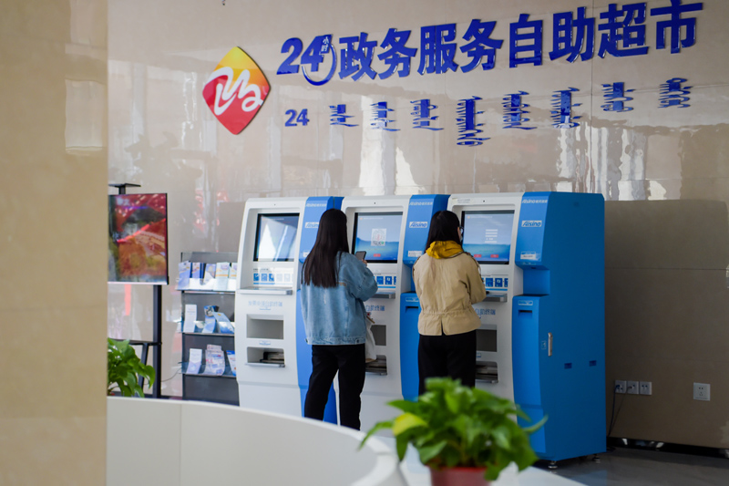 在內(nèi)蒙古自治區(qū)呼和浩特市玉泉區(qū)政務(wù)服務(wù)中心的“24小時政務(wù)服務(wù)自助超市”,市民在自助辦理發(fā)票業(yè)務(wù)(2022年4月2日攝)。新華社記者 李志鵬 攝
