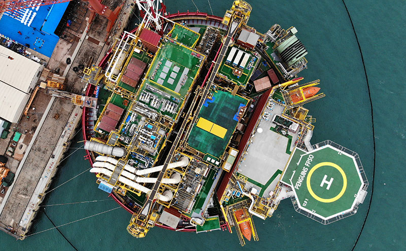 這是11月29日在山東青島拍攝的企鵝圓筒型浮式生產儲卸油裝置(FPSO)(無人機照片)。