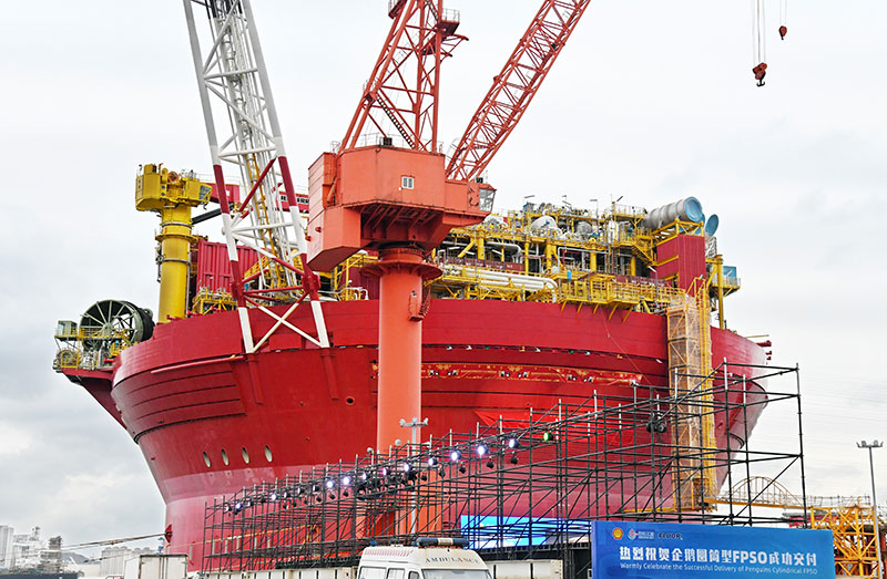 這是11月29日在山東青島拍攝的企鵝圓筒型浮式生產儲卸油裝置(FPSO)交付儀式現場。
